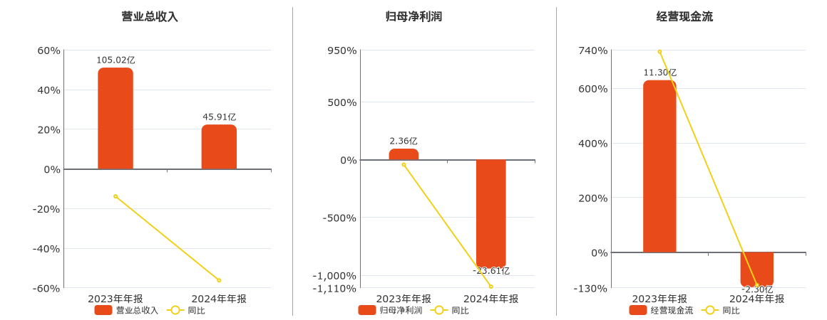 公司营业总收入为45.91亿元,较去年同报告期营业总收入减少59.11亿元,同比较去年同期下降56.28%。归母净利润为-23.61亿元,在已披露的同业公司中排名第94,较去年同报告期归母净利润减少25.97亿元,同比较去年同期下降1100.46%。经营活动现金净流入为-2.30亿元,在已披露的同业公司中排名第92,较去年同报告期经营活动现金净流入减少13.60亿元,同比较去年同期下降120.33%。